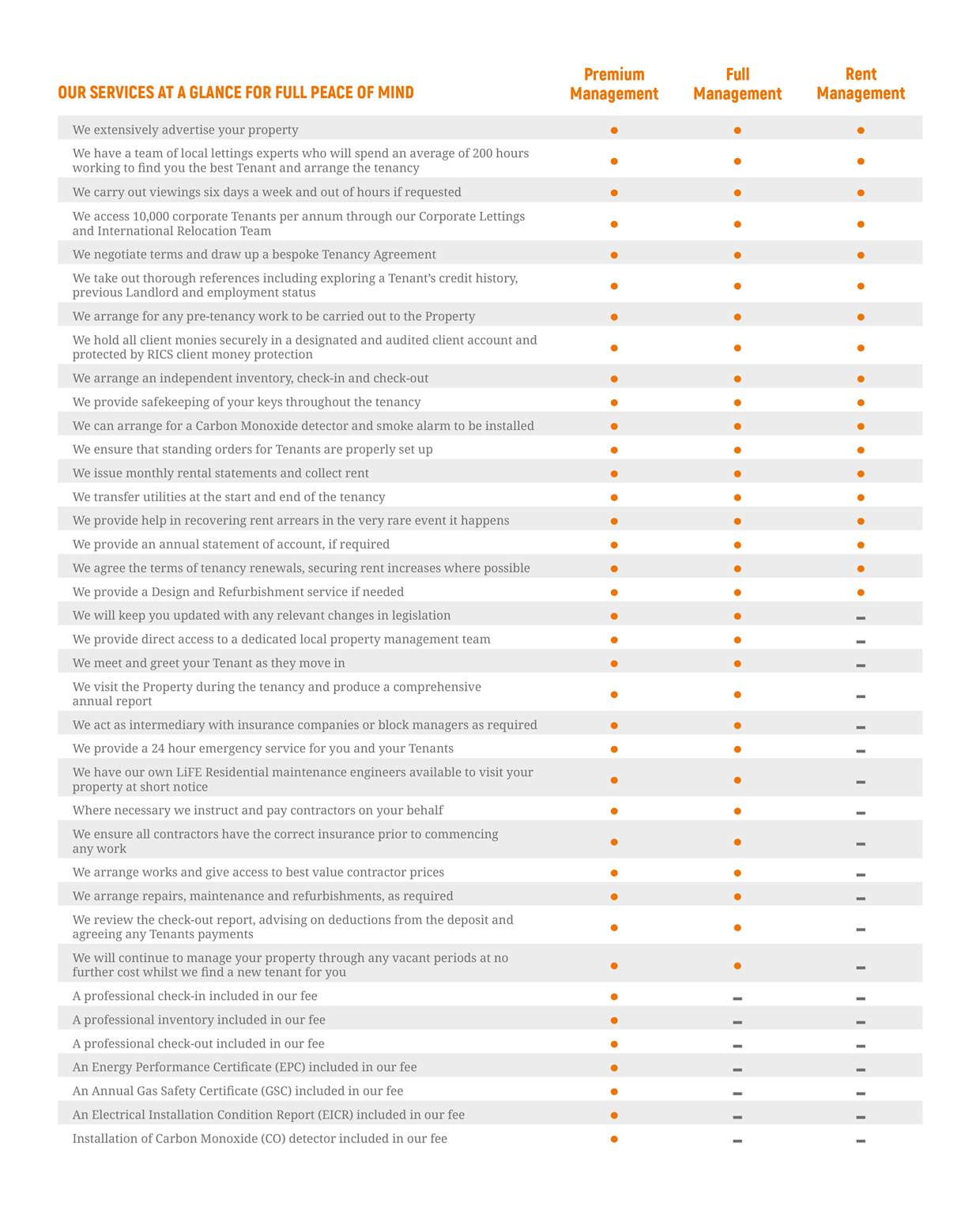 In addition to our Premium Management service we also offer a comprehensive all inclusive Full Management service at 16% (19.2% incl VAT) and a Rent Management service which is charged at 11% (13.2% incl VAT) as detailed above. By choosing either of these services the following additional charges would apply: